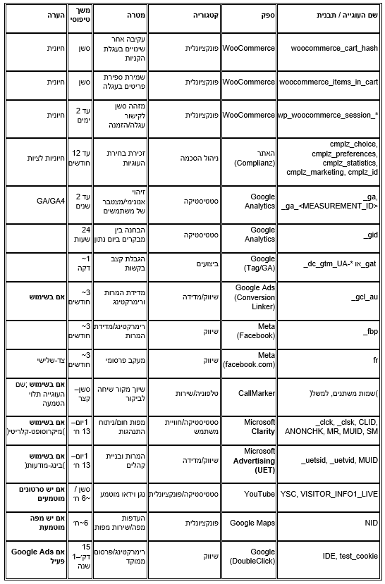 4.2. דוגמאות לעוגיות נפוצות באתר (הרשימה עשויה להתעדכן, ראו נספח עוגיות בסוף מדיניות זו):