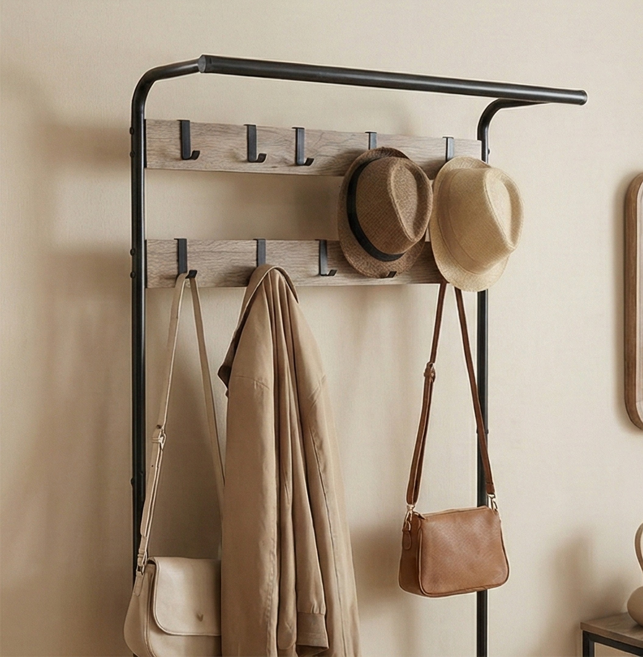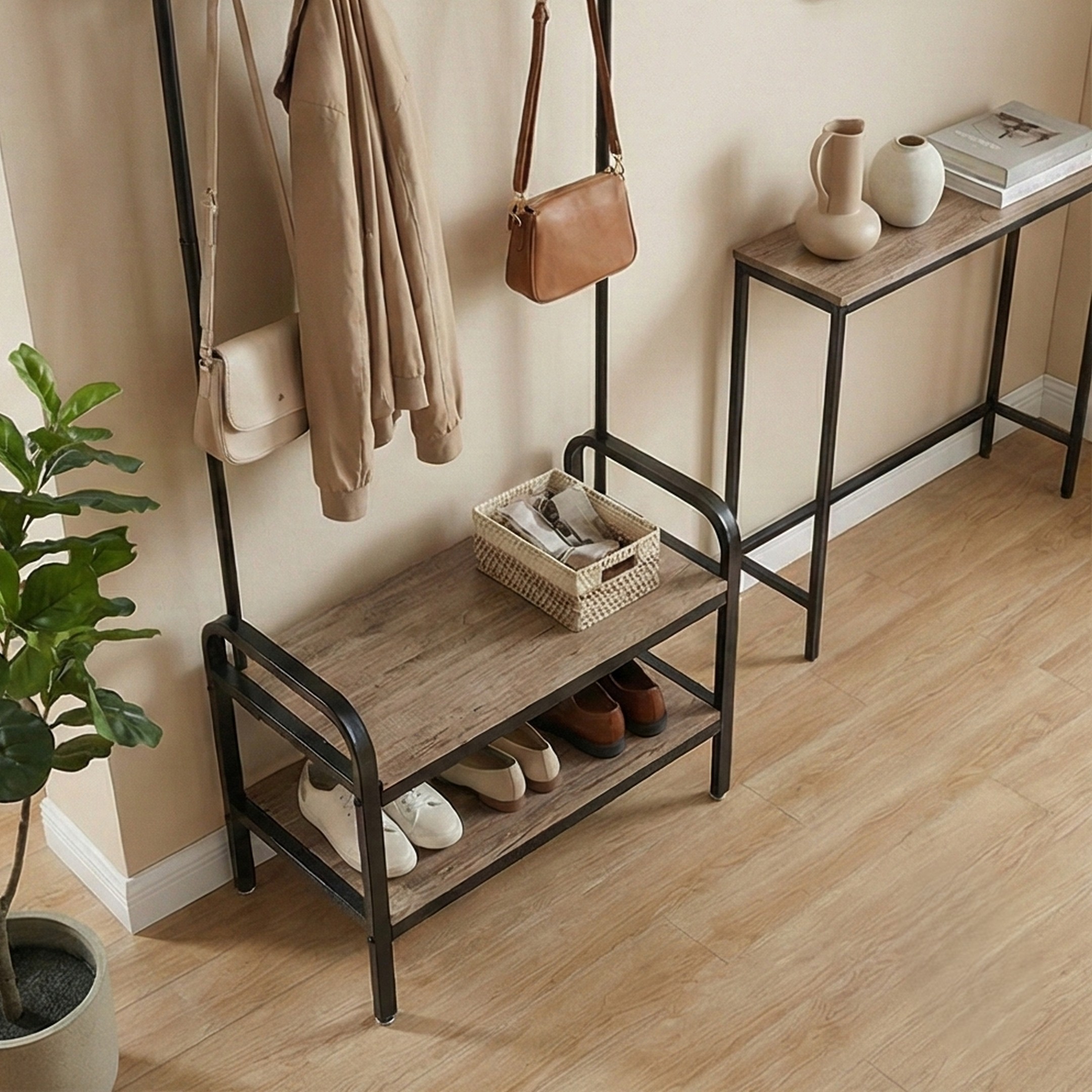 יחידה שימושית המשלבת מתלה מעילים כפול, מוט לקולבים ומדפי נעליים לארגון מלא של המבואה