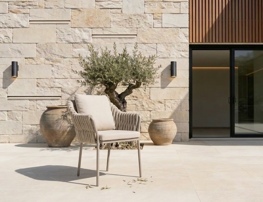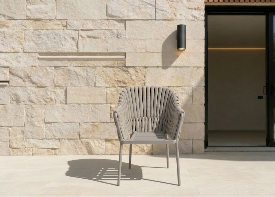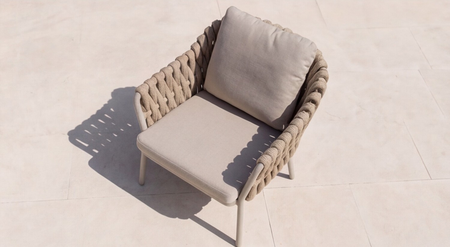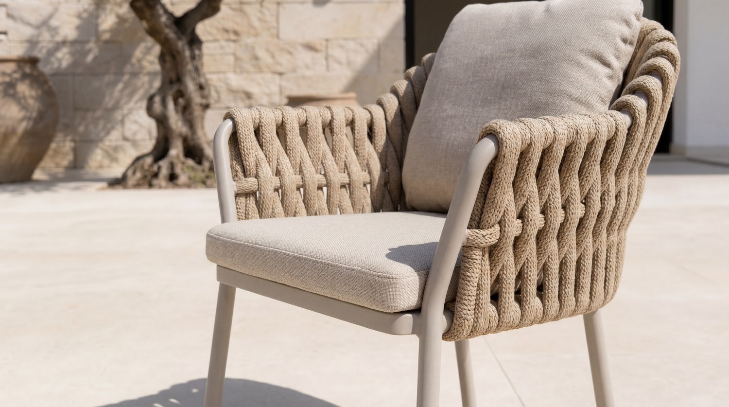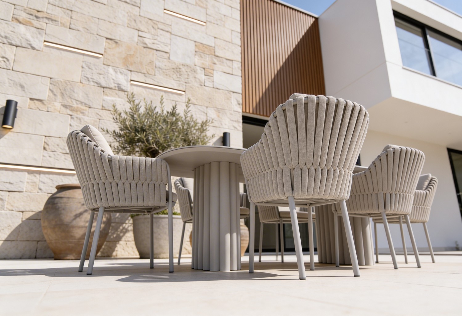 כיסא חוץ יוקרתי ומודרני בעיצוב חבלים טרנדי, המשתלב בצורה מושלמת עם שולחנות חוץ בסגנון אלגנטי ועכשווי.