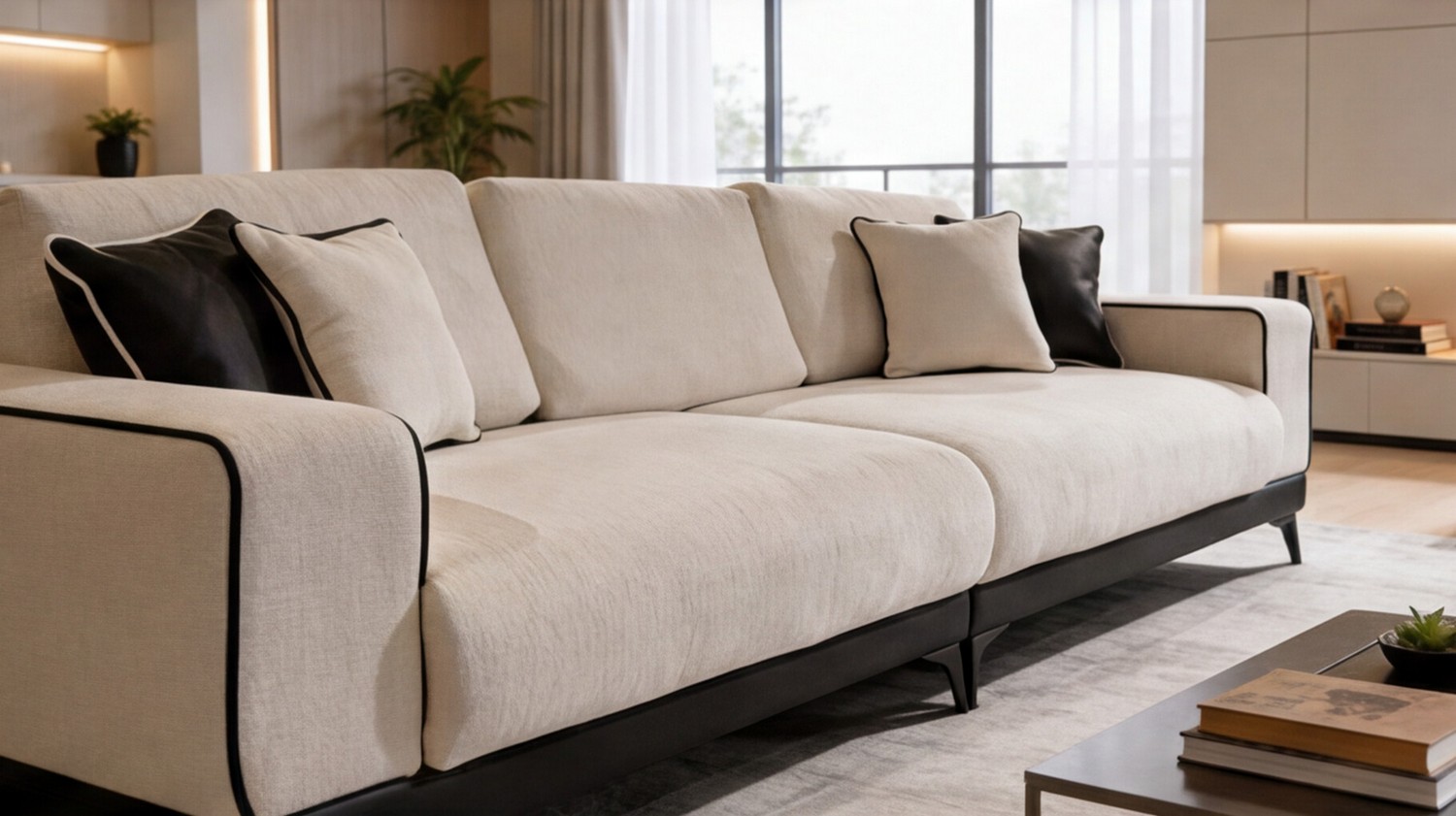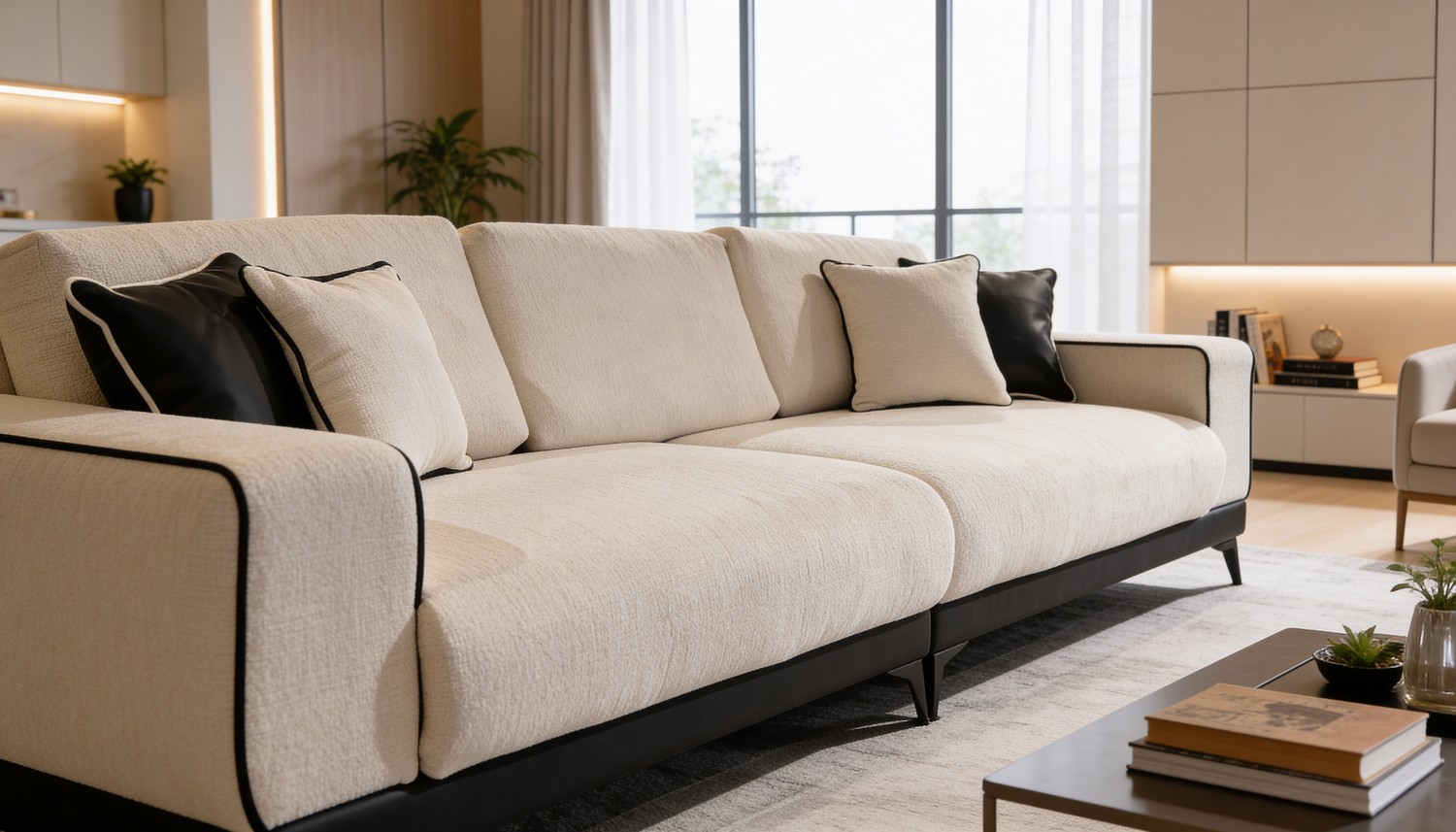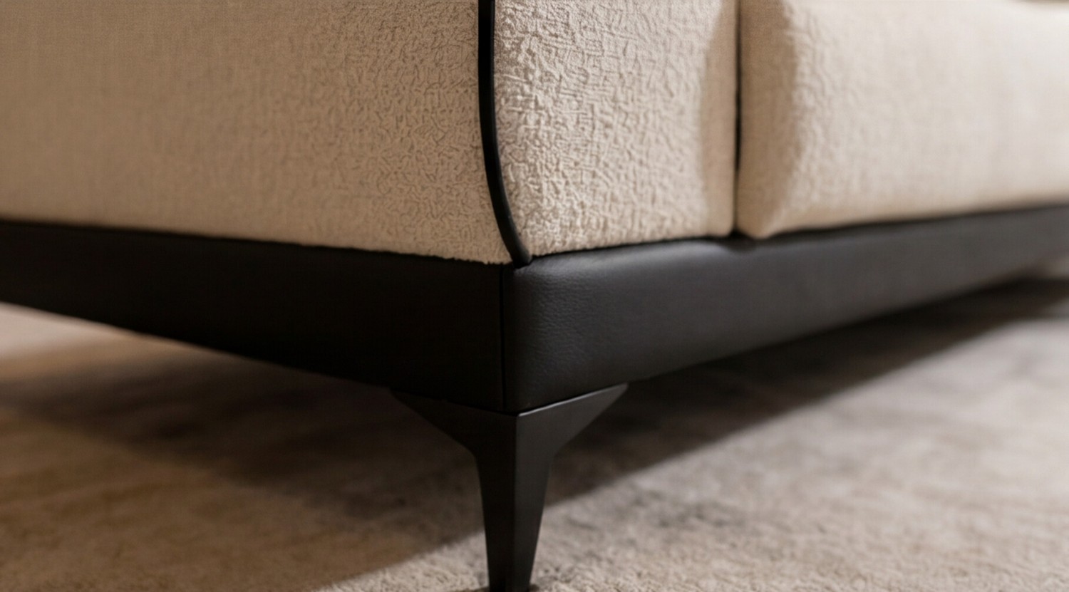 הסלון מרופד בבד איכותי מסוג סנו 1, עם קדר שחור המדגיש את קווי העיצוב ומעניק לסלון מראה ייחודי ויוקרתי.