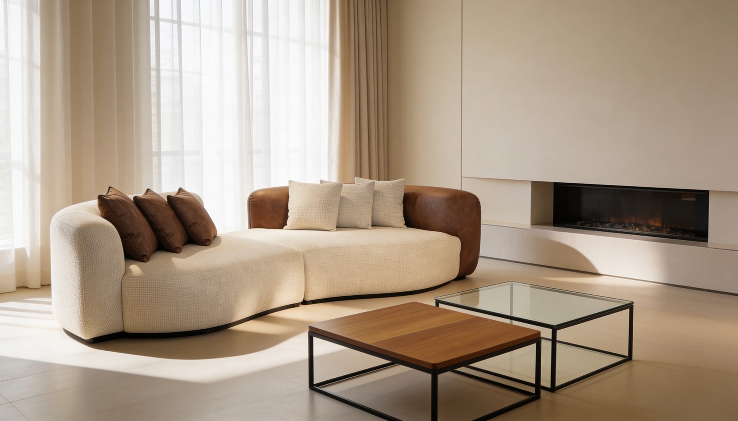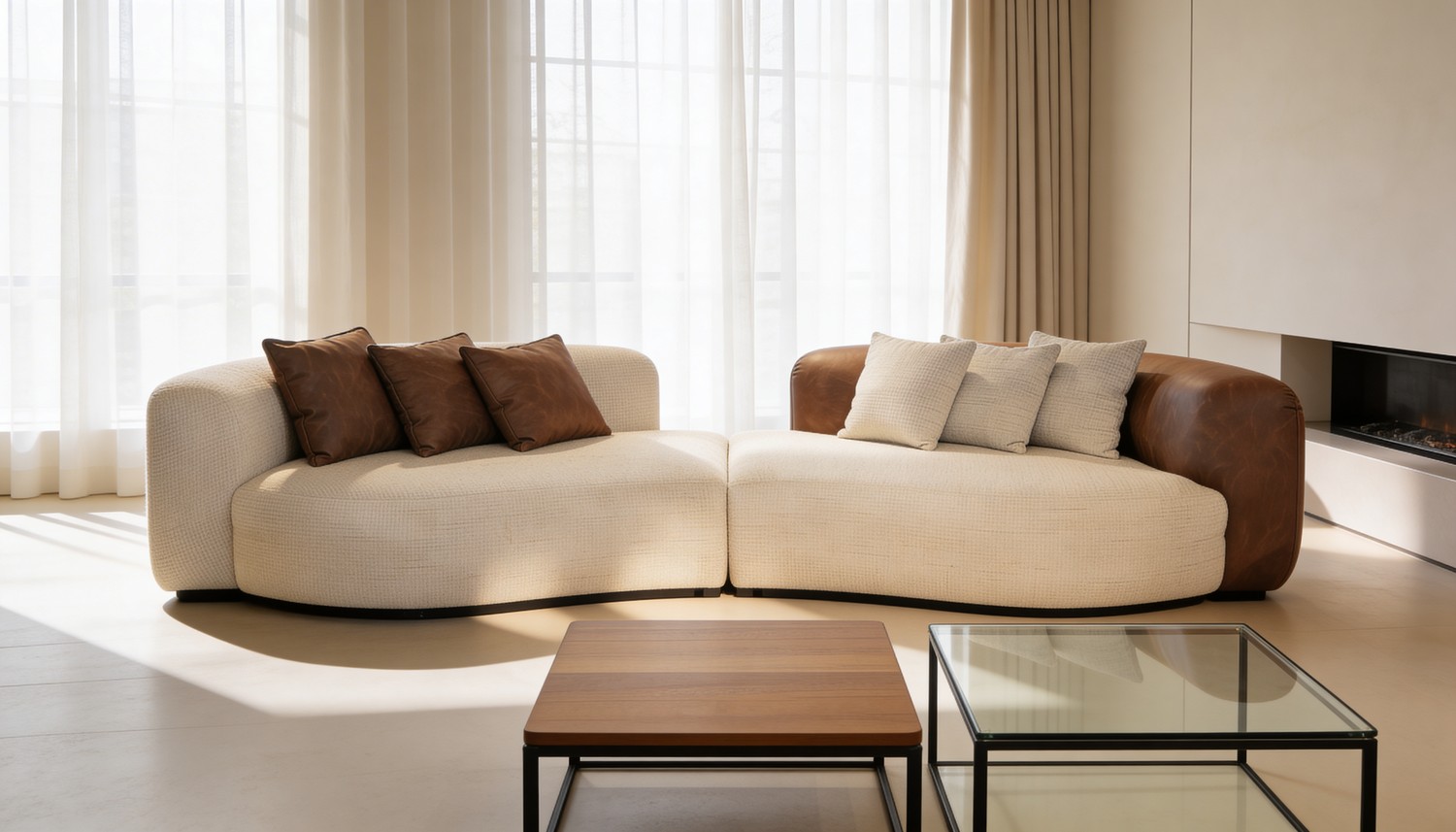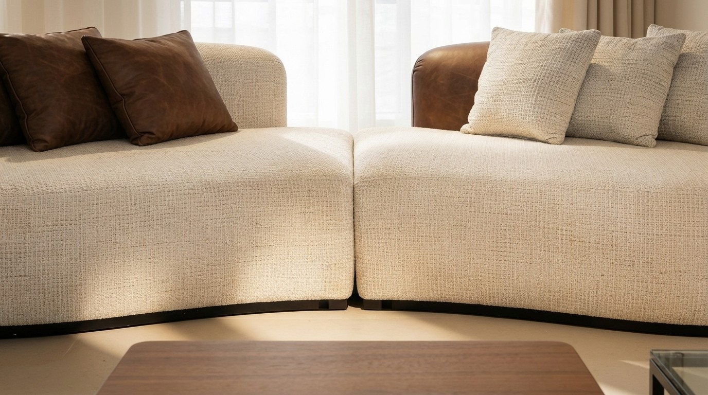 הסלון מרופד בשילוב של בד איכותי מסוג דומו 2 Nabil Zaid יחד עם רוגל 301, לצד אלמנטים בדמוי עור המעניקים מראה יוקרתי ועמידות גבוהה לשימוש יומיומי.