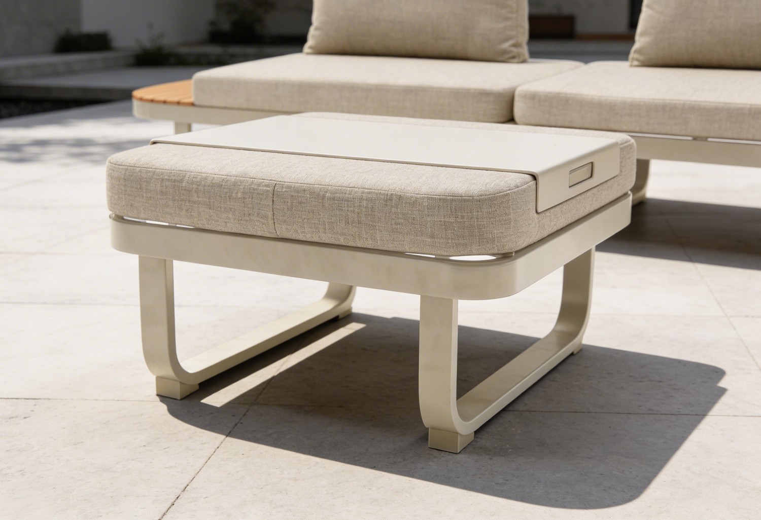 פינת ישיבה מעוצבת בקווים נקיים המשלבת שלדת אלומיניום חזקה עם עץ שיטה טבעי וקליעת חבלים איכותית.