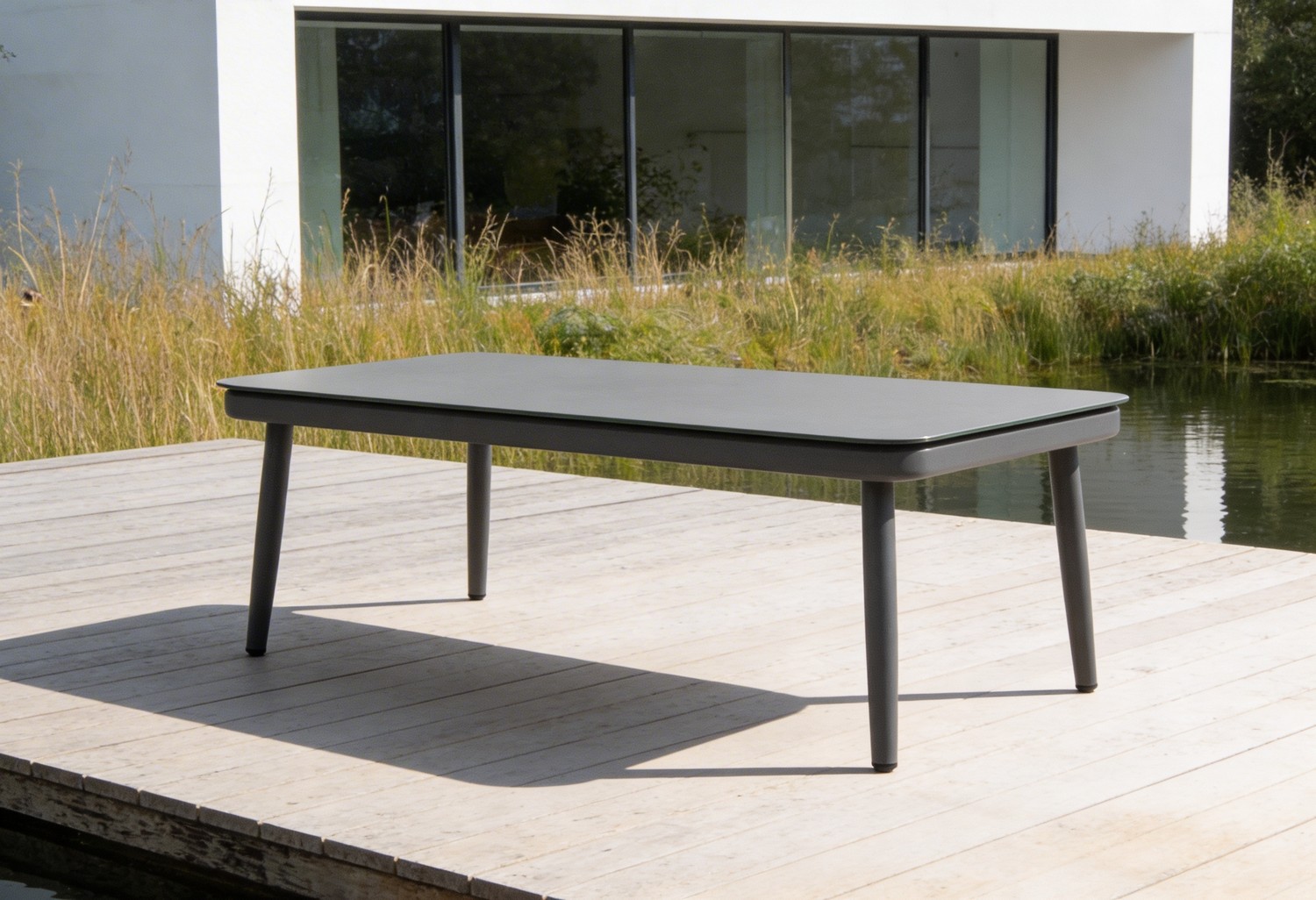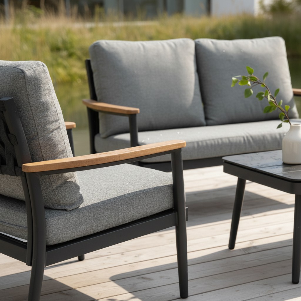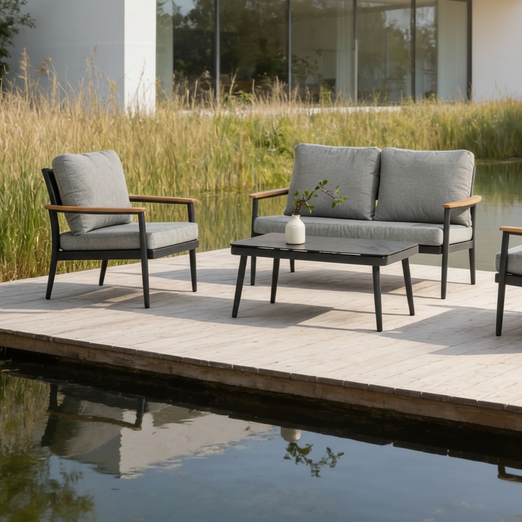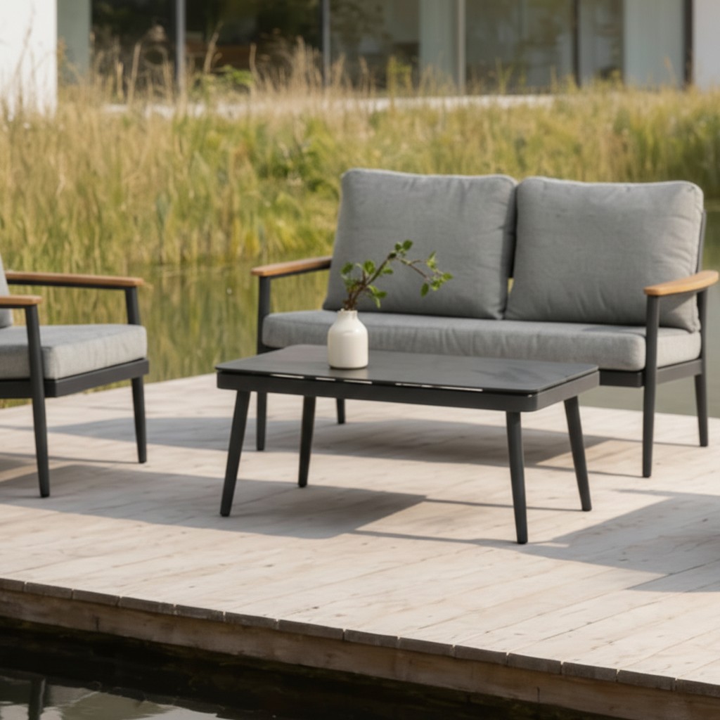פינת ישיבה מעוצבת המשלבת שלדת אלומיניום מסיבית, משטח זכוכית קרמית יוקרתית וידיות דמוי עץ ליצירת מראה חם ומודרני כאחד.