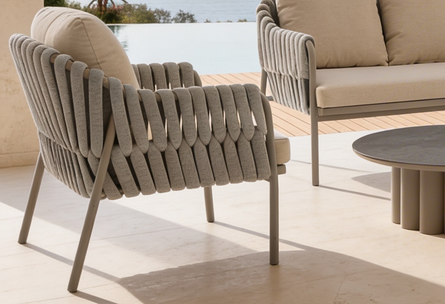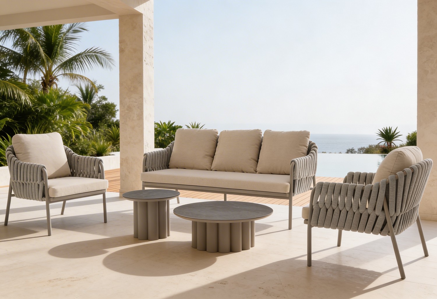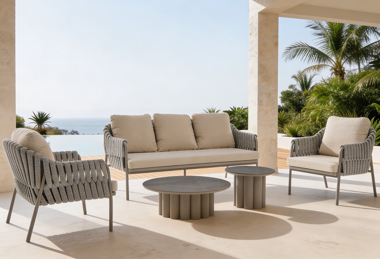 מערכת ישיבה יוקרתית ומרשימה במיוחד, בעיצוב מודרני בגימור חבלים טרנדי המעניק מראה אלגנטי ומעודכן לכל גינה או מרפסת.