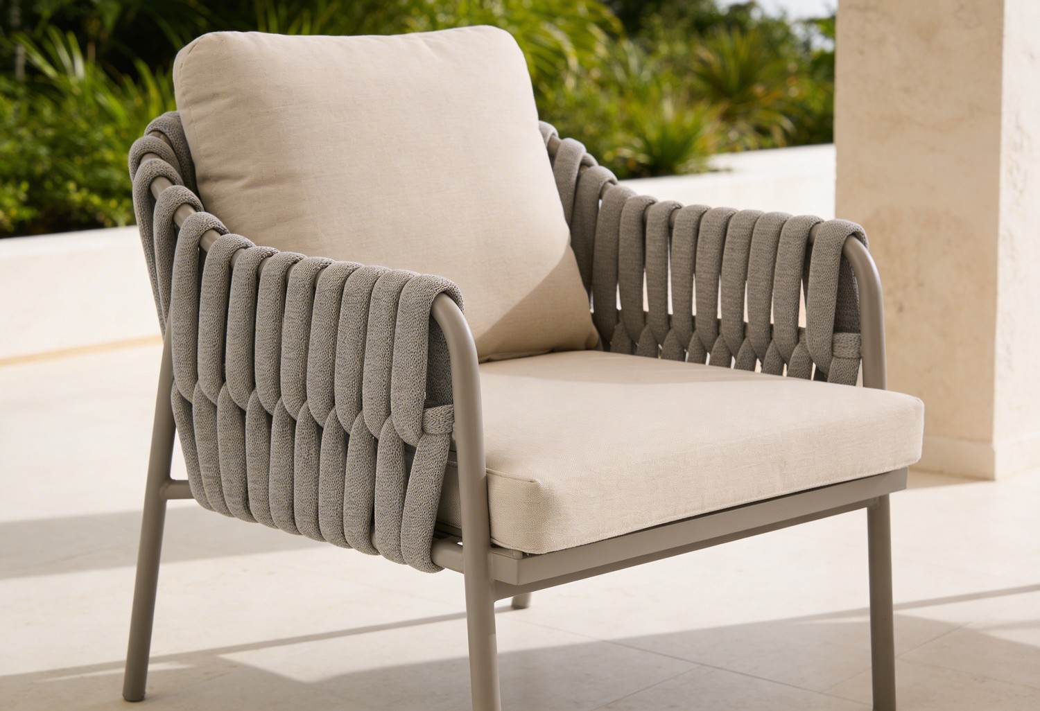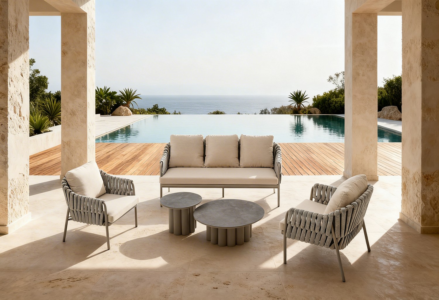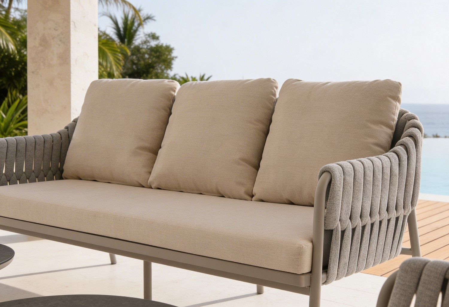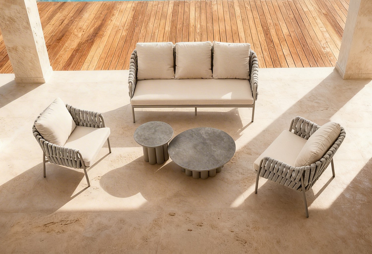 מערכת ישיבה יוקרתית ומרשימה במיוחד, בעיצוב מודרני בגימור חבלים טרנדי המעניק מראה אלגנטי ומעודכן לכל גינה או מרפסת.