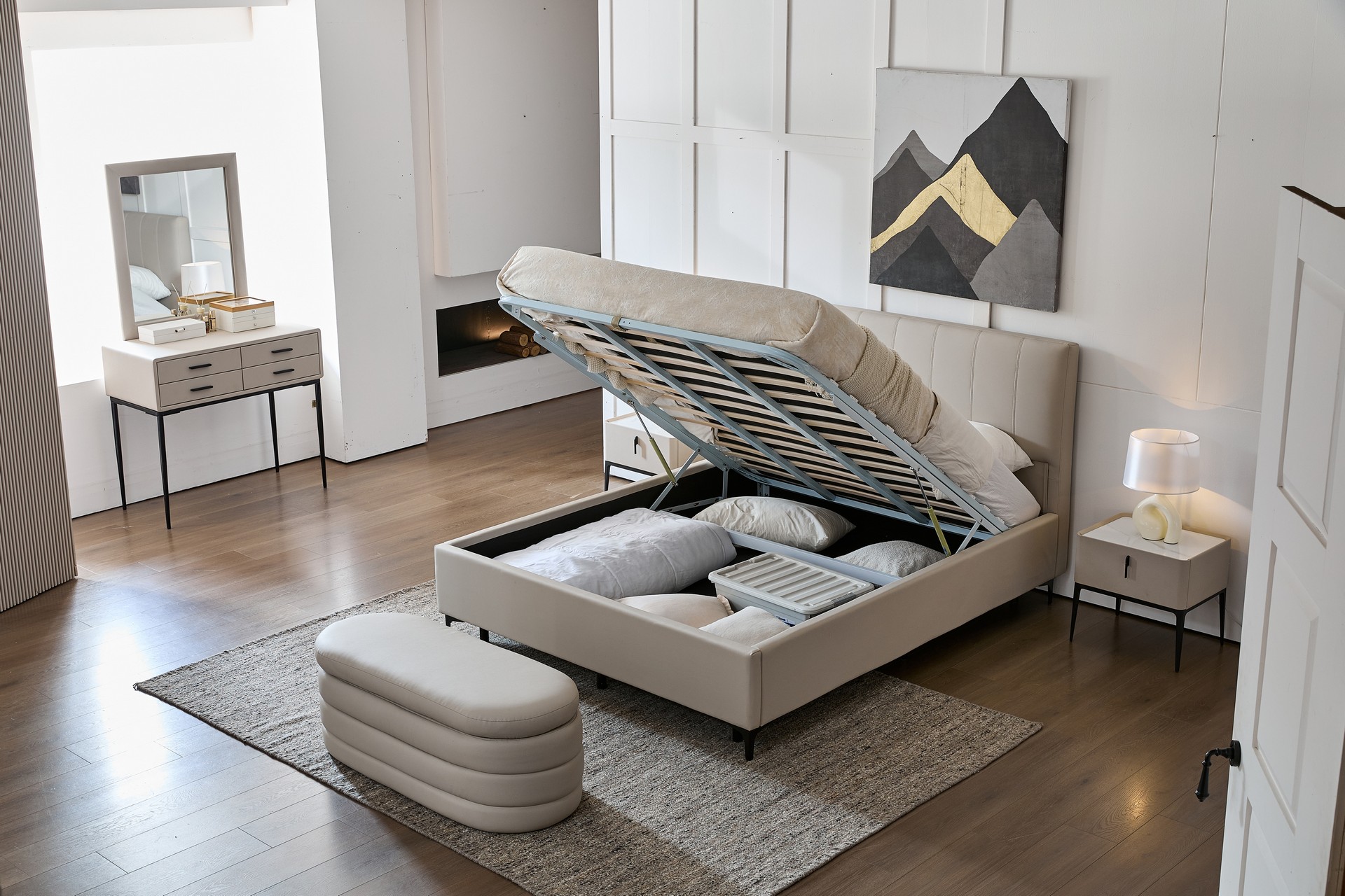 מיטה מעוצבת דגם ‘לונדוןכולל ארגז מצעים גוון סהרה במקום 4500 ש”ח רק 2490 ש”ח כולל מזרן מתנה !!!