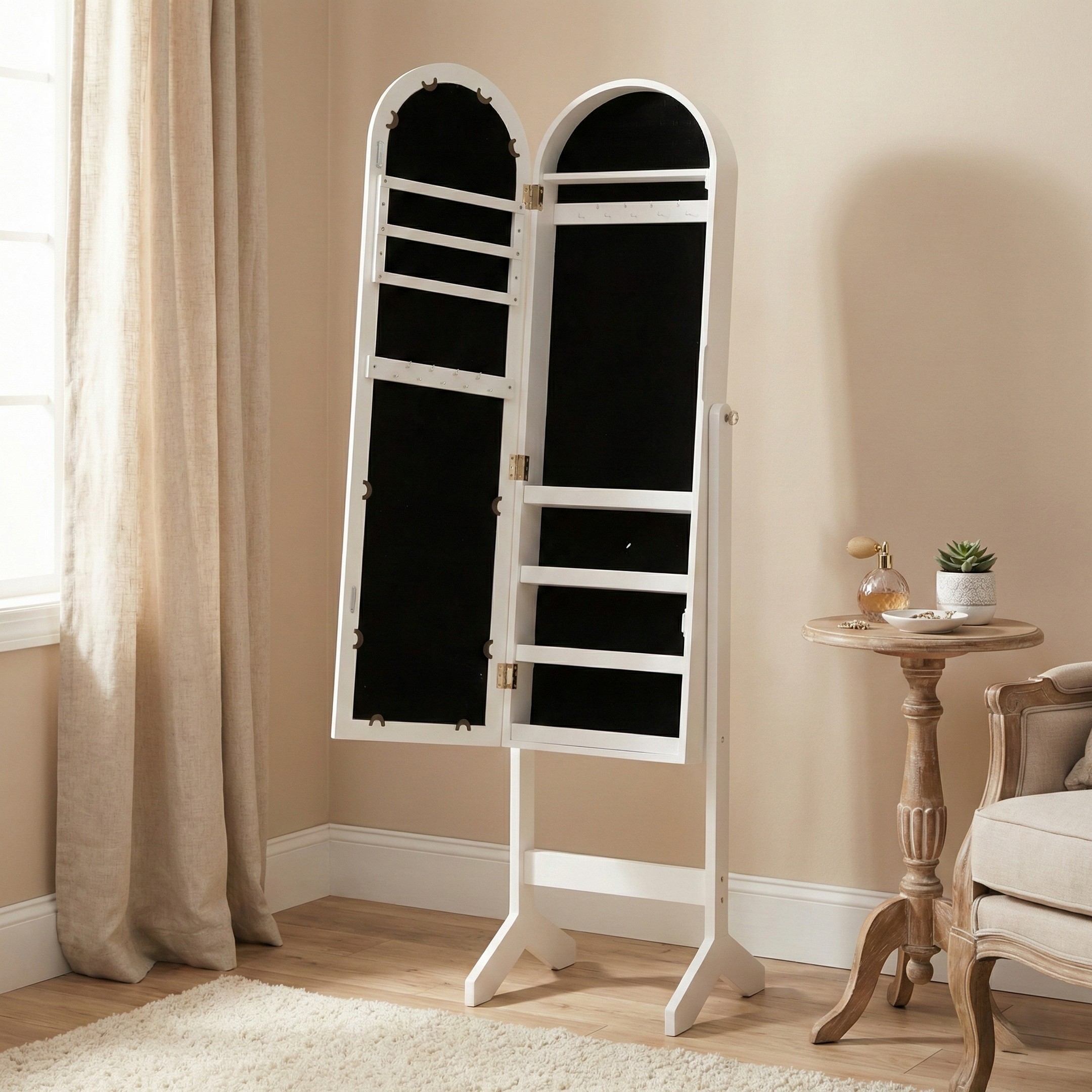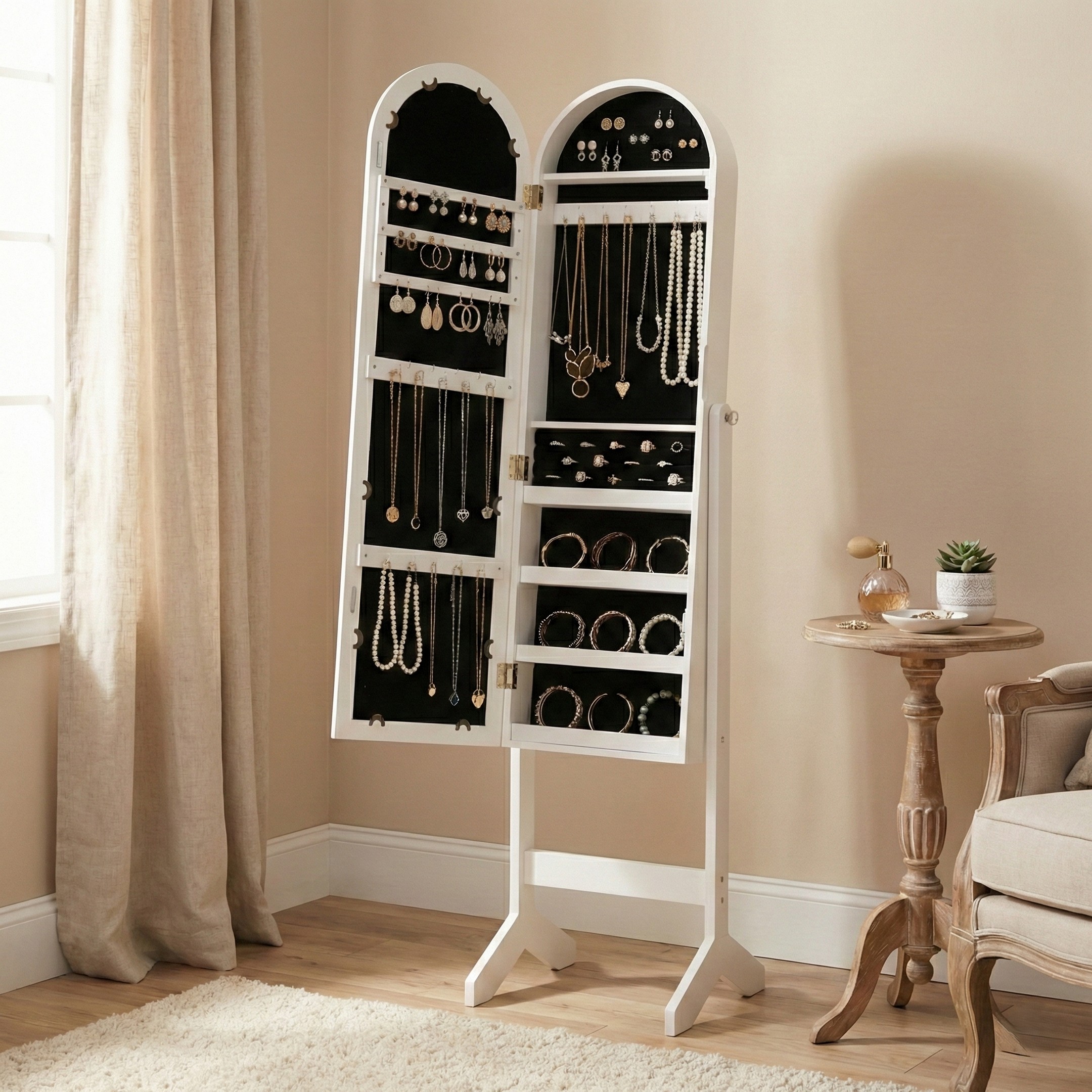 פתרון 2 ב-1 המשלב מראת גוף מלאה עם ארון תכשיטים מרווח לשמירה על סדר וחיסכון במקום
