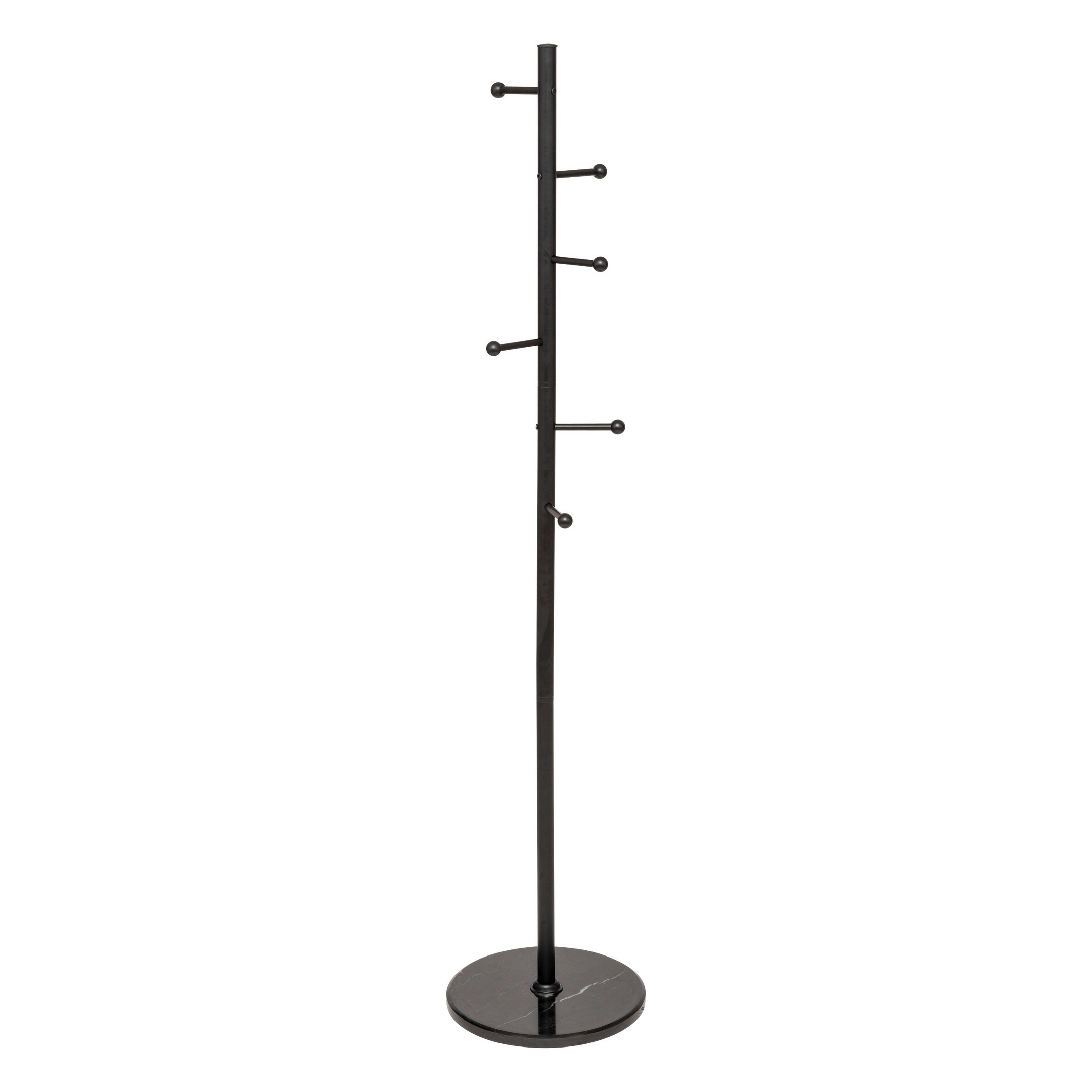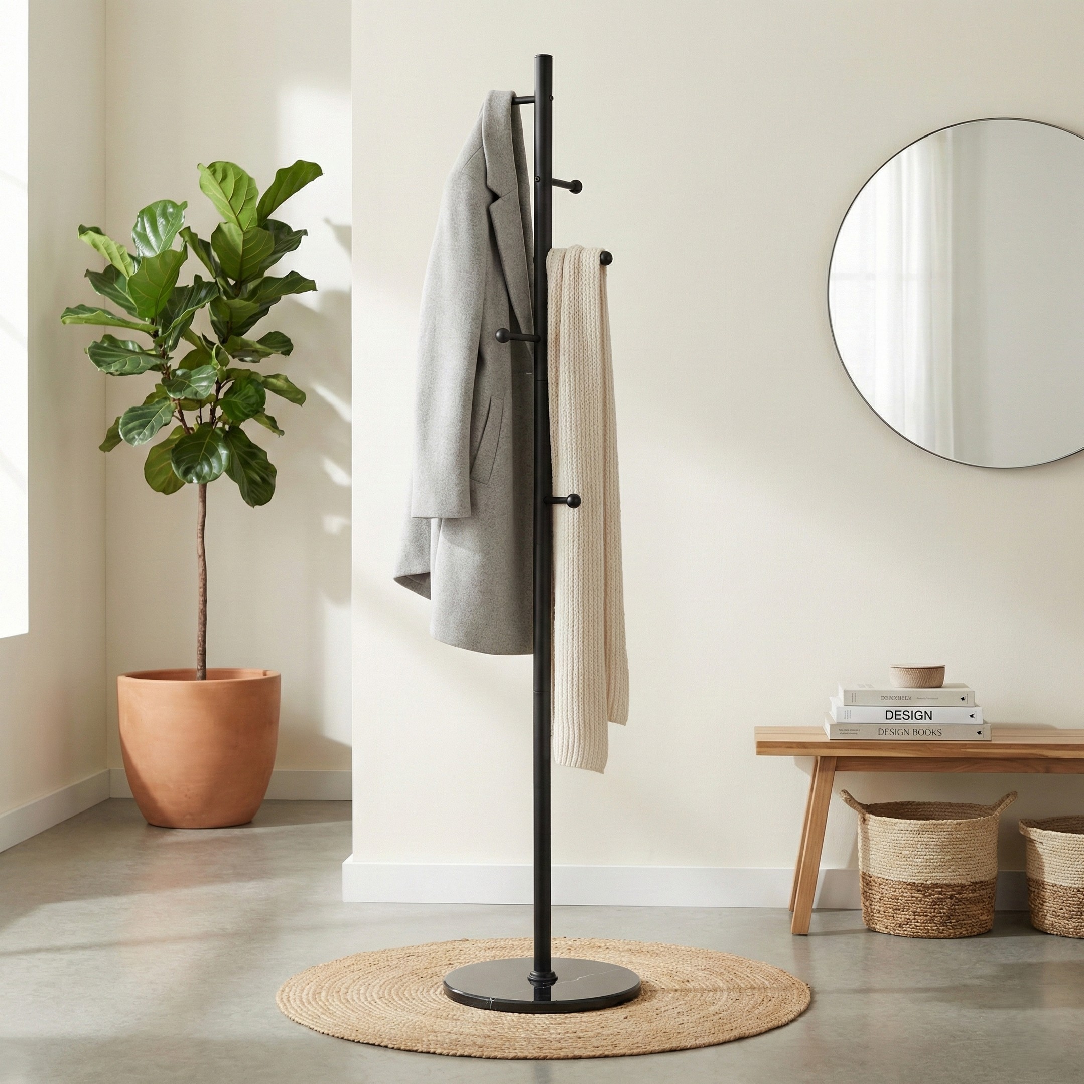מתלה בגדים עומד בעיצוב מודרני ואלגנטי, עם עמוד מתכת שחור מט ובסיס עגול משיש אמיתי.