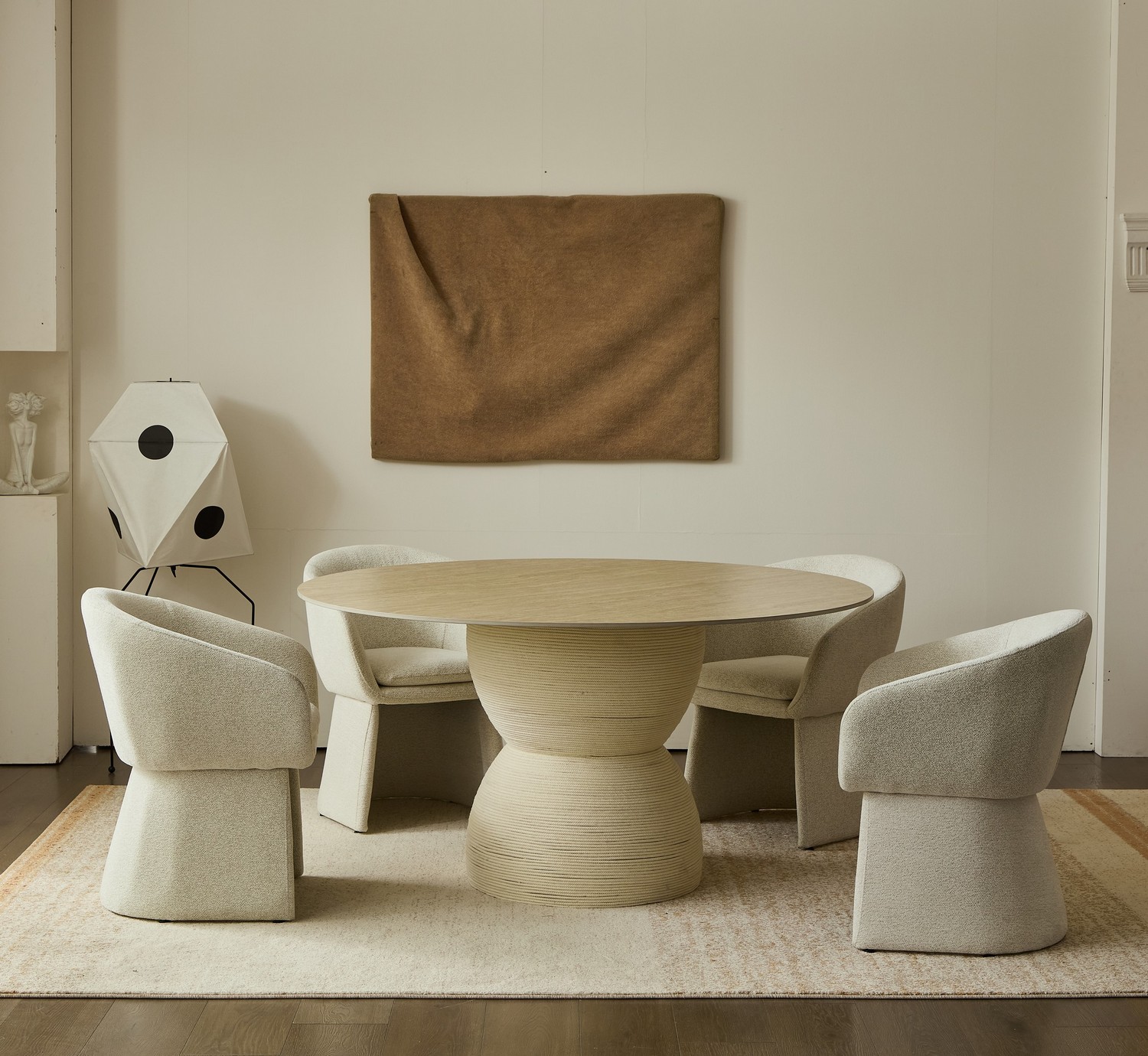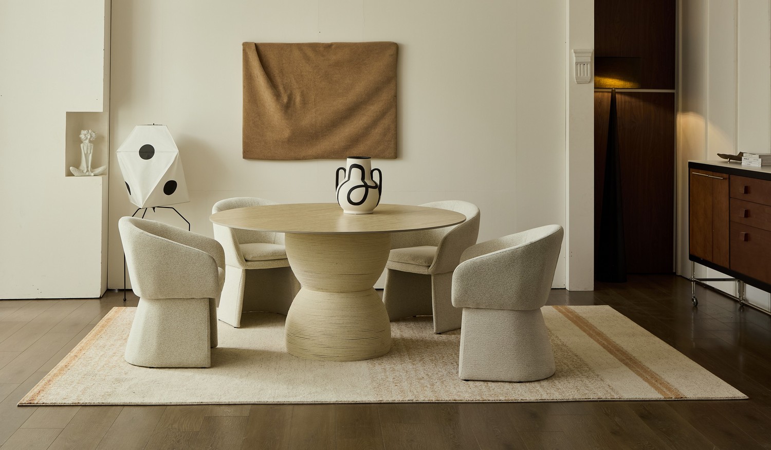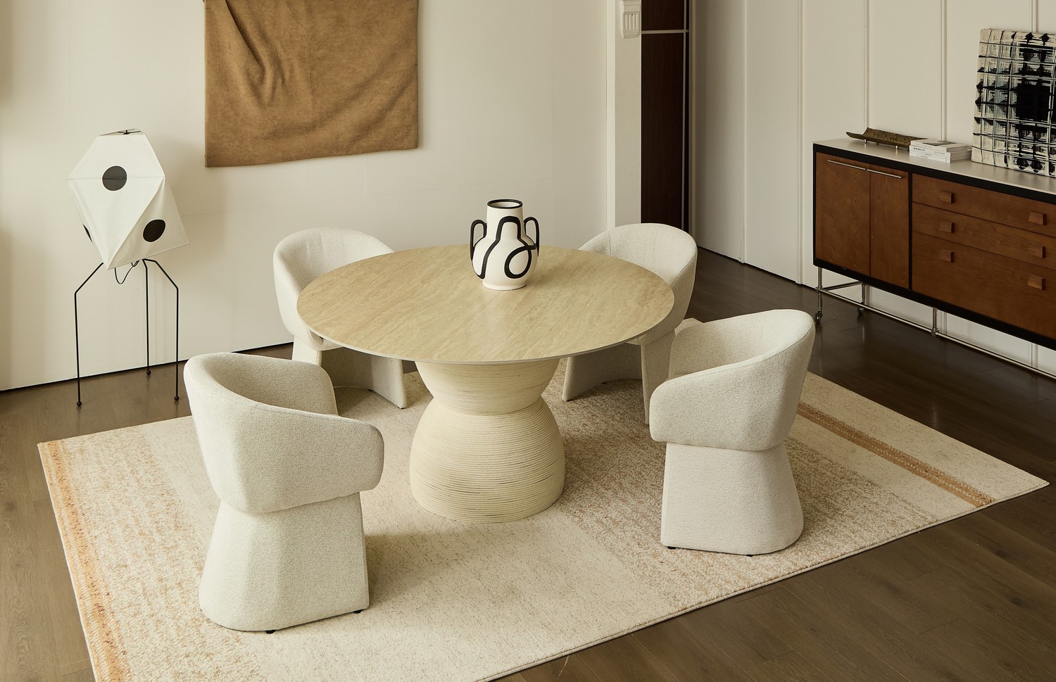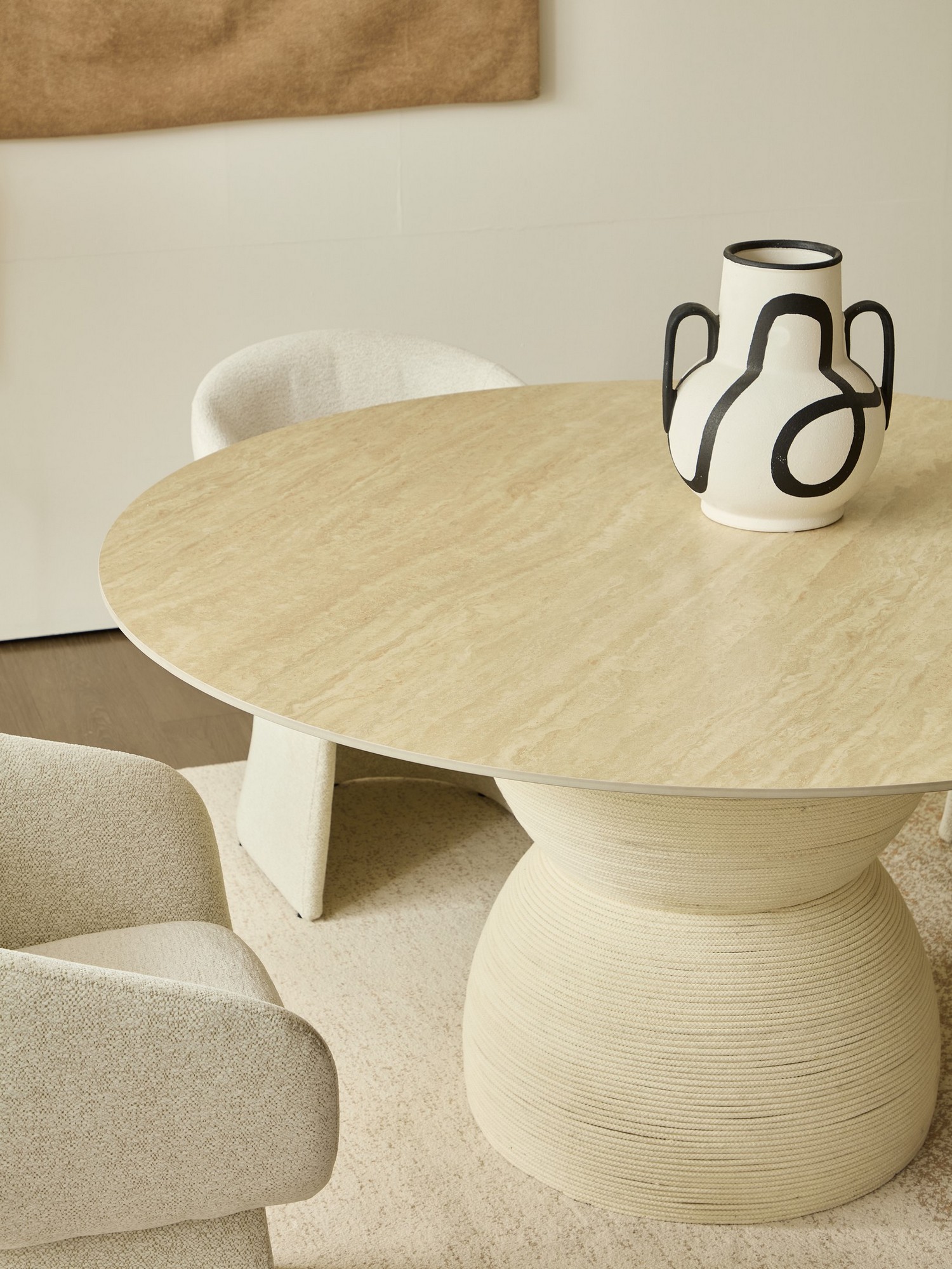 שולחן עגול ומרשים במראה אבן, המעניק לסלון נוכחות יוקרתית ומודרנית.